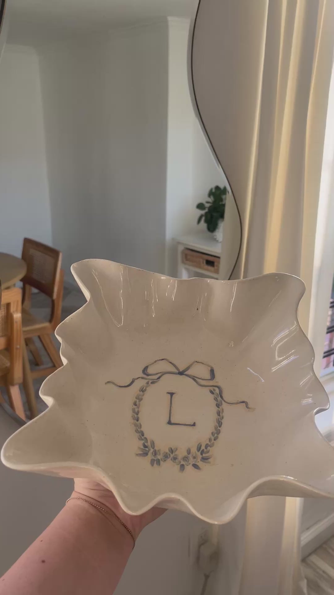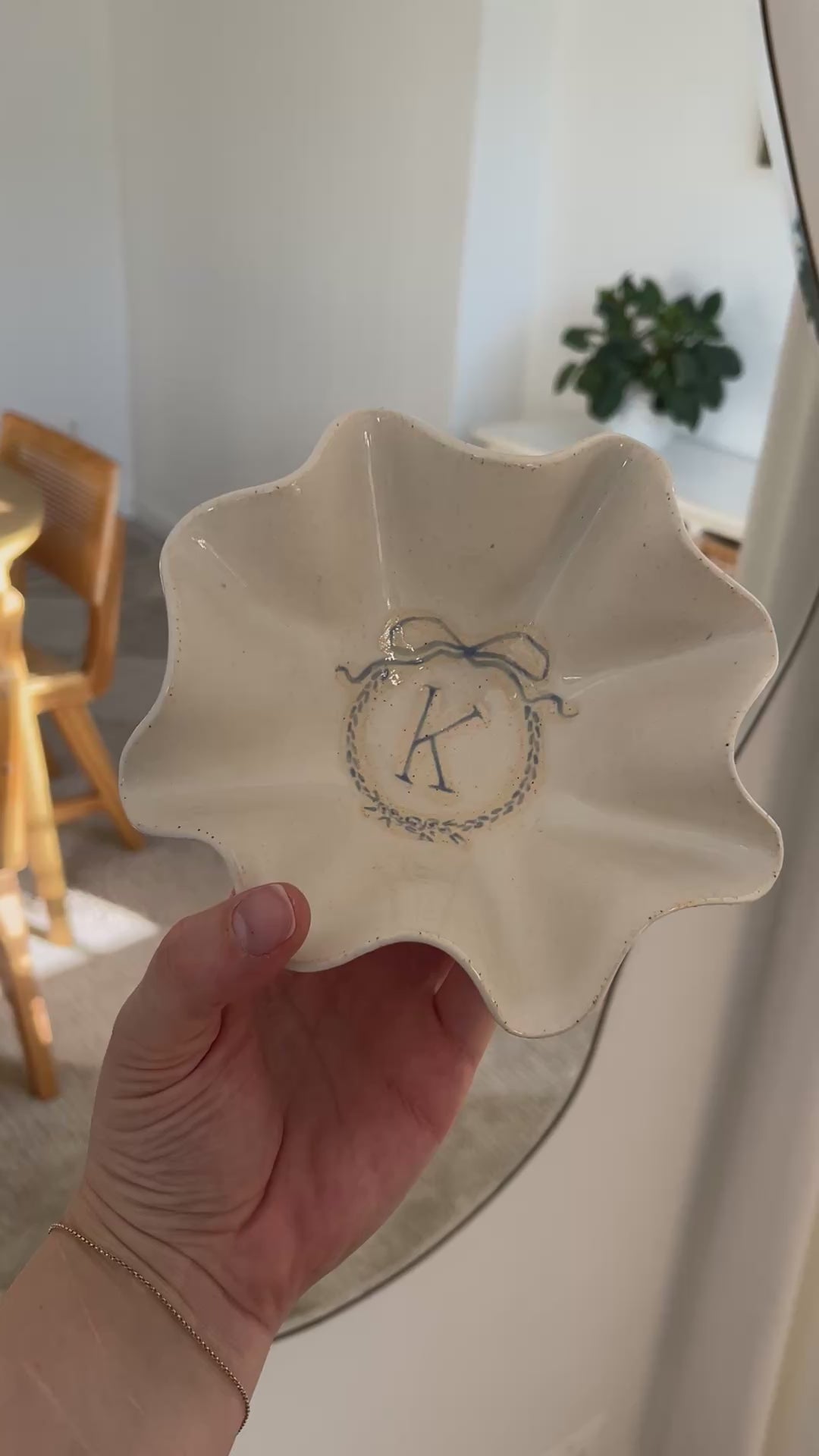 This handmade organic ruffle bowl features a rustic, off white glossy glaze. Choose between an initial monogram or bow detail for the center of the piece. With a minimal design, this bowl has organic waves and ruffles that are unique to each piece. This ruffle bowl is the perfect size for a jewelry dish or bedside catch-all. Food safe.